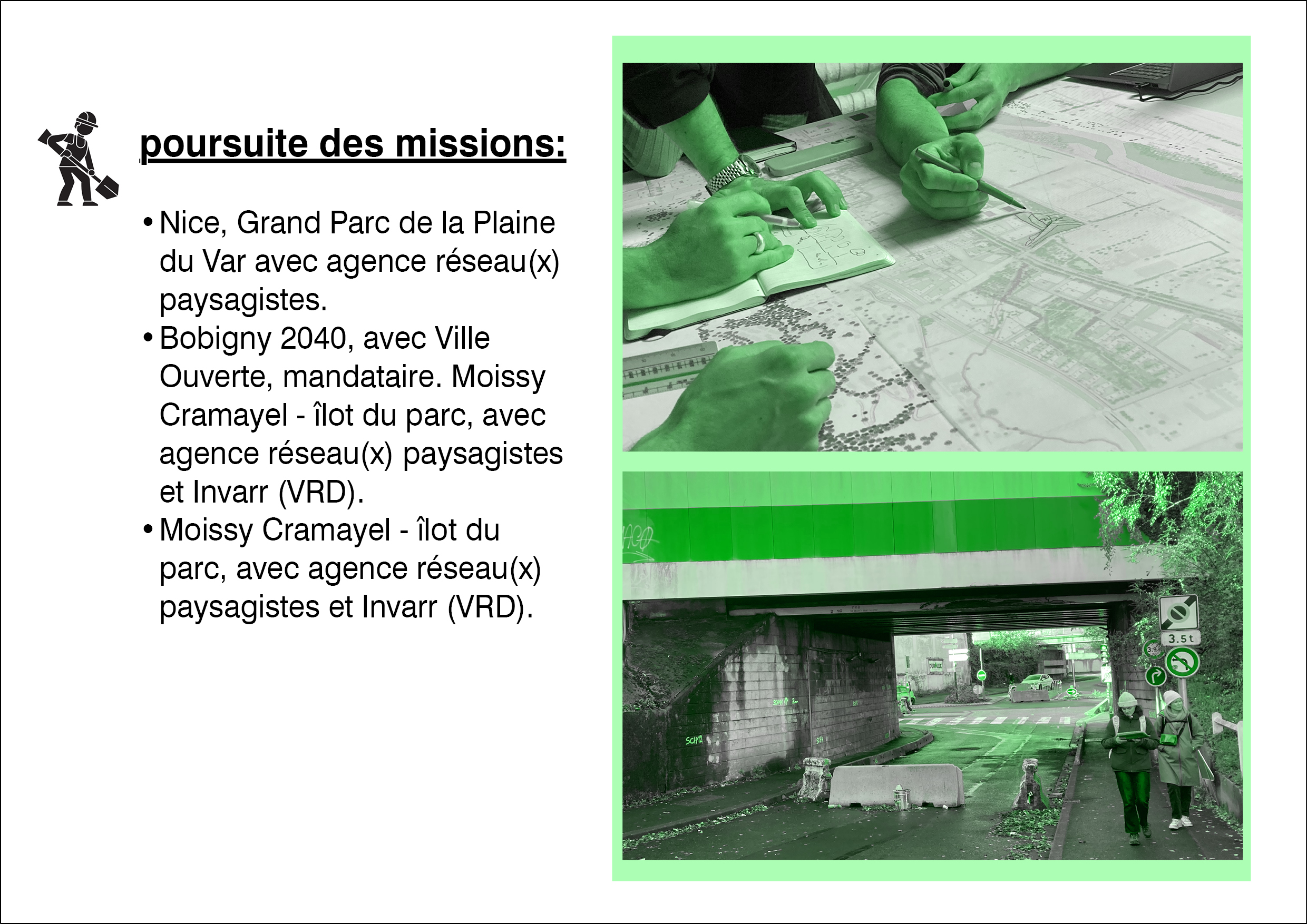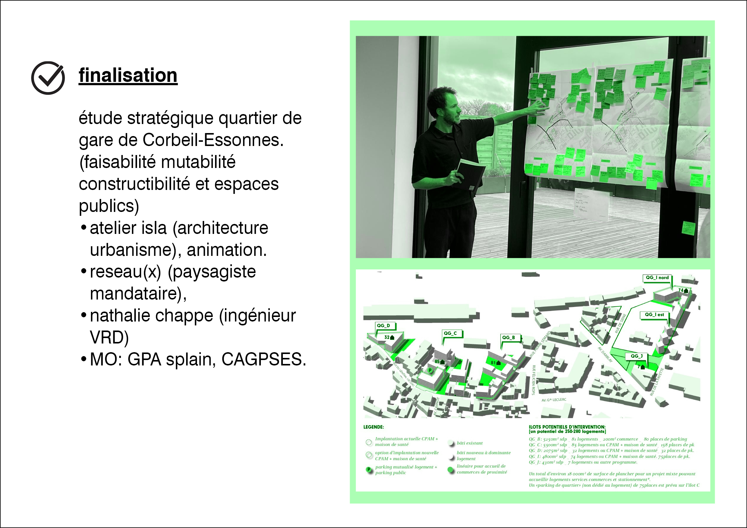 un exemple? Nous travaillons depuis 2024 avec agence reseau(x) paysage sur le quartier de l’îlot du parc à Moissy Cramayel (77), pour la réalisation d’un parc urbain, la requalification de 4 rues et la réalisation de 185 logements. atelier isla en pilotage de la maîtrise d’oeuvre urbaine [plan guide - CPAUPE - fiches de lots - suivi des lots, etc] et agence reseau(x) de la maîtrise d’oeuvre des espaces publics. [AVP - PRO - chantier].