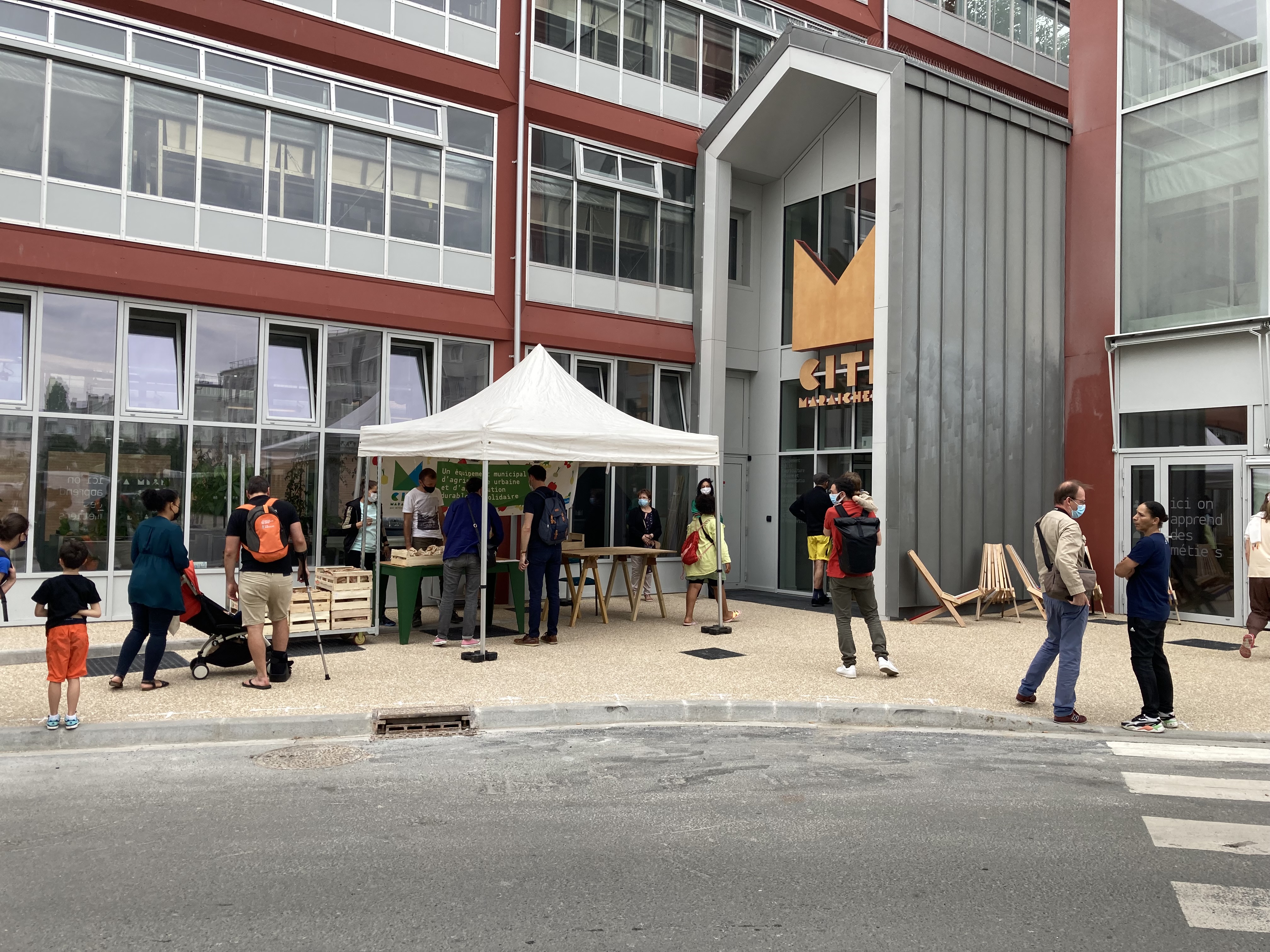 Sur le parvis de la serre pédagogique est positionnée une «végé-table», combinaison de mobilier urbain de type table de quartier et verger en libre service. C’est une «aide à l’appropriation de l’espace public». Cet hyper-meuble atypique est «capable» dans le sens ou il ne dicte pas un usage prédéfini. Devant l’entrée de la cité maracihère, la terrasse du café-cantine permet de croquer à pleines dents les fruits et légumes hyper-locaux qui ont poussé dans les étages et dans la ruelle qui fait face à la maison des retraités, des plusieurs jardins pédagogiques invitent à explorer les modes de gouvernance d’un espace public comestible.